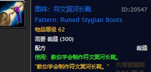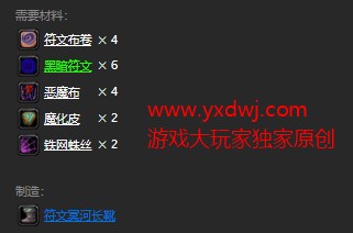 符文冥河长靴由裁缝制作,需要熟练度300点,以下是制作所需的材料: