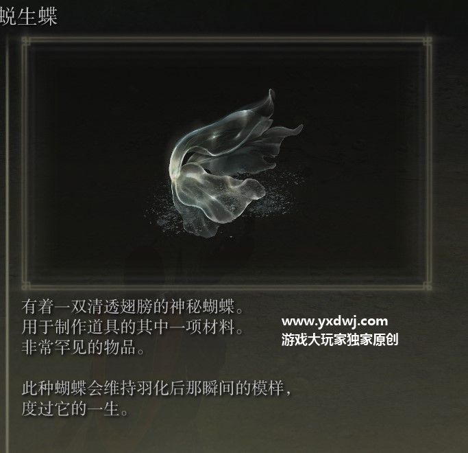 艾尔登法环蜕生蝶有什么用?蜕生蝶效果介绍艾尔登法环里面我们在前期一些紫色的点里面经常能够捡到蜕生蝶这个道具,很多的玩家都不知道这个有什么用,小编一开始也有一阵子不知道,现在在下面给大家带来这个道具的使用方法介绍,希望能够帮助到大家,具体如下: