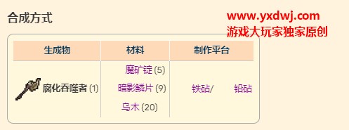 泰拉瑞亚灾厄腐化吞噬者召唤杖怎么合成?灾厄腐化吞噬者武器合成表泰拉瑞亚灾厄是一个泰拉瑞亚知名度非常高的大型mod,在里面有大量的新武器,腐化吞噬者就是其中之一,也是制作永夜之眼武器所需要的材料之一,很多的玩家不知道要怎么制作这个武器,小编也给大家带来了相关的武器合成表介绍,让大家知道要怎么合成这个武器,具体如下: