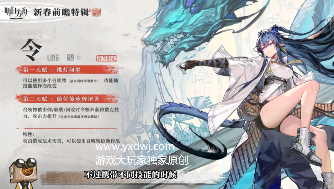 明日方舟令技能天赋介绍-明日方舟令强度厉害吗值得抽吗明日方舟再今天晚上也是推出了最新的新限定干员令,作为干员年还有夕的姐姐,精致的立绘以及独特的机制也让大家大呼过瘾,相当期待这个新年的限定新角色,虽然现在官方还没有发公告,但是已经有一些内容放出了,玩家们可以参考一下下面的技能天赋介绍吗,看一下强度是否厉害并且是否值得抽,赶紧参考看看吧!