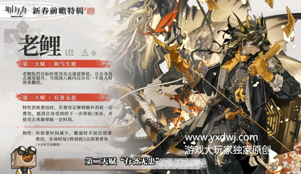 明日方舟老鲤技能天赋介绍-明日方舟老鲤值得抽吗强度如何厉害吗明日方舟在今天的新春直播上面也是公布了最新的陪跑干员老鲤,这次在池子里和新干员令一起推出,是一个全新的六星行商类型的角色,机制非常的特殊,多种不同的技能方式都可以应对完全不一样的机制,而且还有全新的免控反弹机制,想要知道这个老鲤的角色天赋技能介绍的话,就参考一下下面的内容吧!
