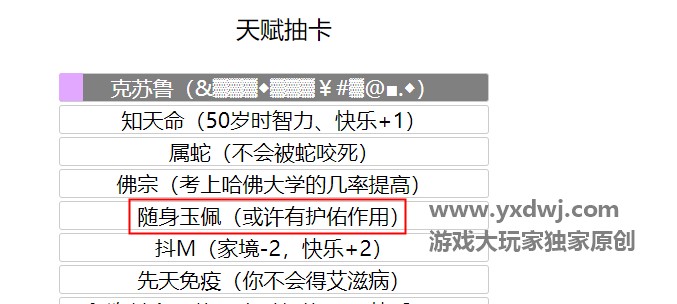 人生重开模拟器随身玉佩有什么用?人生重开模拟器天赋随身玉佩介绍人生重开模拟器是一款最近特别热门的模拟生存的游戏,在里面有一个普通的天赋叫做随身玉佩,很多的玩家们很好奇这个天赋具体有什么用,小编也给大家带来了这个随身玉佩的功效说明,希望能够帮助到你,在里面让你直到这个天赋功能说明,具体如下: