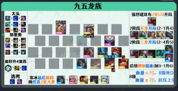 云顶之弈S5.5龙族九五阵容搭配-云顶5.5九五之尊阵容玩法攻略S5.5新加了龙族转职书、龙族加里奥,2阶段也能达成5龙蹭金蛋,经济原地起飞,但龙族打工雀氏比常规打工队弱些,本文就会对龙族的升级、打工搭配、后期强化做进一步解析,游戏中建议在有2星乌迪尔时且2阶段起码能白嫖到3龙时玩这套阵容,永远快别人一个时间点跳下一级,5龙有就上,上了就再提速跳级巩固自身,再从5龙降成3龙拼多多,最终留下大头、加里奥,其他龙牌全卖,空位全上大哥。