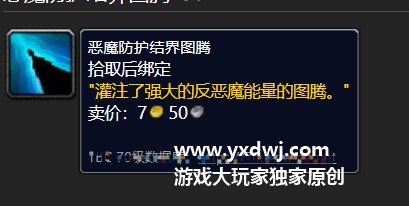 恶魔防护结界图腾在哪买?tbc其他的材料恶魔防护结界图腾获得方法恶魔防护结界图腾是玩家们在其他的材料任务之中需要的道具之一,别的东西都可以直接在拍卖行买单,但是这个道具就需要玩家们前往沙塔斯的贫民窟进行购买,直接花钱就可以在NPC那里买到,但是很多玩家也不看任务描述的,小编就给大家带来了这个恶魔防护结界图腾道具获取方法,具体如下: