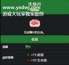 星露谷物语生鱼片配方怎么获得?星露谷物语生鱼片怎么做?星露谷物语是一款大家都很喜欢的农场模拟经营玩法的游戏,在游戏之中是有一种菜品叫做生鱼片,可以帮助玩家处理早期那些不值钱的鱼类,是早期非常赚的配方之一,小编在这里也给大家带来了生鱼片的具体配方,有需求的玩家们不妨赶紧参考一下试试看吧,具体如下: