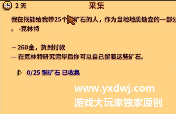 星露谷物语铜矿石任务交不了怎么办?星露谷物语铜矿石怎么给克林特星露谷铜矿石收集任务是游戏之中克林特会发布的一个需要铜矿石的任务,很多的玩家们都会在做完了之后这个任务交不了,明明自己身上的矿石数量也是够的,小编在这里也给大家带来了这个铜矿石任务的具体完成方法,有需求感兴趣的玩家们就赶紧参考对照一下试试看吧,具体如下: