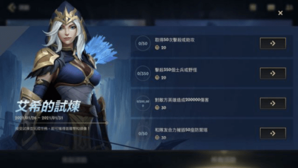 lol手游艾希的试炼怎么做-lol手游艾希任务怎么完成本周lol手游推出了新的限时活动“艾希的试炼”,来增加玩家的活跃度,这次的游戏奖励物品,不是常规的蓝色精萃或者经验卡,而是普罗币,这是英雄联盟手游的专属货币,可以用来解锁一些游戏物品,玩家们完成任务就可以获得奖励,反正免费的东西,自然是多多益善。