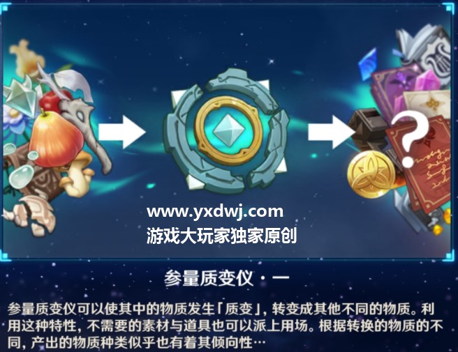 原神参量质变仪能质变出什么?原神参量质变仪怎么用?参量质变仪是原神1.3版本之中加入了全新的一款道具,可以帮助玩家们转化一些自己没用的道具变成更加有效的道具,完美的解决了收集到的很多物品没用的问题,不少的玩家们不知道这个参量质变仪能够质变出什么物品,小编在这里也给大家带来了一系列的相关攻略,感兴趣的玩家们不妨参考一下下面的攻略试试看吧,具体如下: