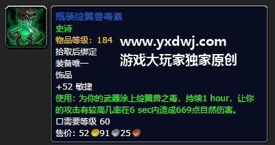 魔兽世界9.0瓶装绽翼兽毒素好吗?WOW瓶装绽翼兽毒素使用攻略瓶装绽翼兽毒素是通灵战潮的老二掉落的一个敏捷的饰品,饰品很有创意,使用这款道具可以让自己的武器上面涂上毒,然后会有一个一小时的几率触发伤害效果,不少的玩家们都不知道这个饰品是否好用,小编在这里也给大家带来了一些相关的攻略,感兴趣的用户们不妨对照查看一下下面的攻略试试看吧,具体如下: