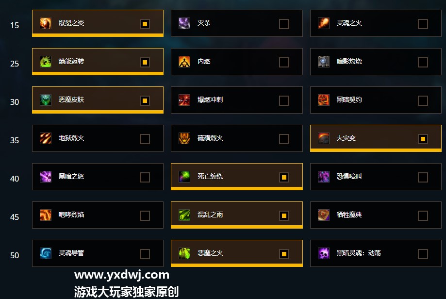 魔兽世界9.0毁灭术大米天赋怎么点?WOW9.0毁灭术士最新天赋推荐毁灭术是术士之中手感玩起来比较好的一个专精,最近也有不少的玩家看到了毁灭术的玩法,感觉玩起来还是挺过瘾的,不少的玩家们都不是很清楚这个毁灭术在现在刷大米的天赋要怎么点,小编现在也自己给大家带来了一些天赋的大米推荐,有需求的玩家们可以对照下面的天赋来加点,具体如下: