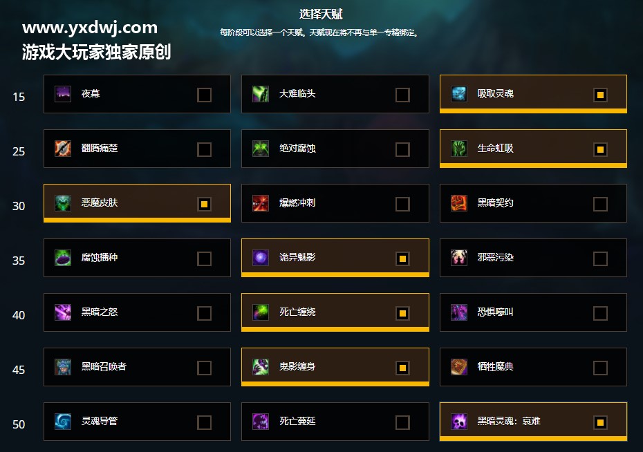 魔兽世界9.0恶魔术士天赋怎么点?WOW9.0恶魔术大米/团本天赋最新推荐恶魔术一直以来都是一个比较冷门的专精,不少的玩家们都不是很清楚这个恶魔术天赋应该要怎么点,不少网上的天赋在这里也已经过时了,小编在这里也给大家带来一些比较新的详细的天赋,玩家们可以对照下面的攻略来参考一下试试看,具体如下: